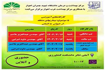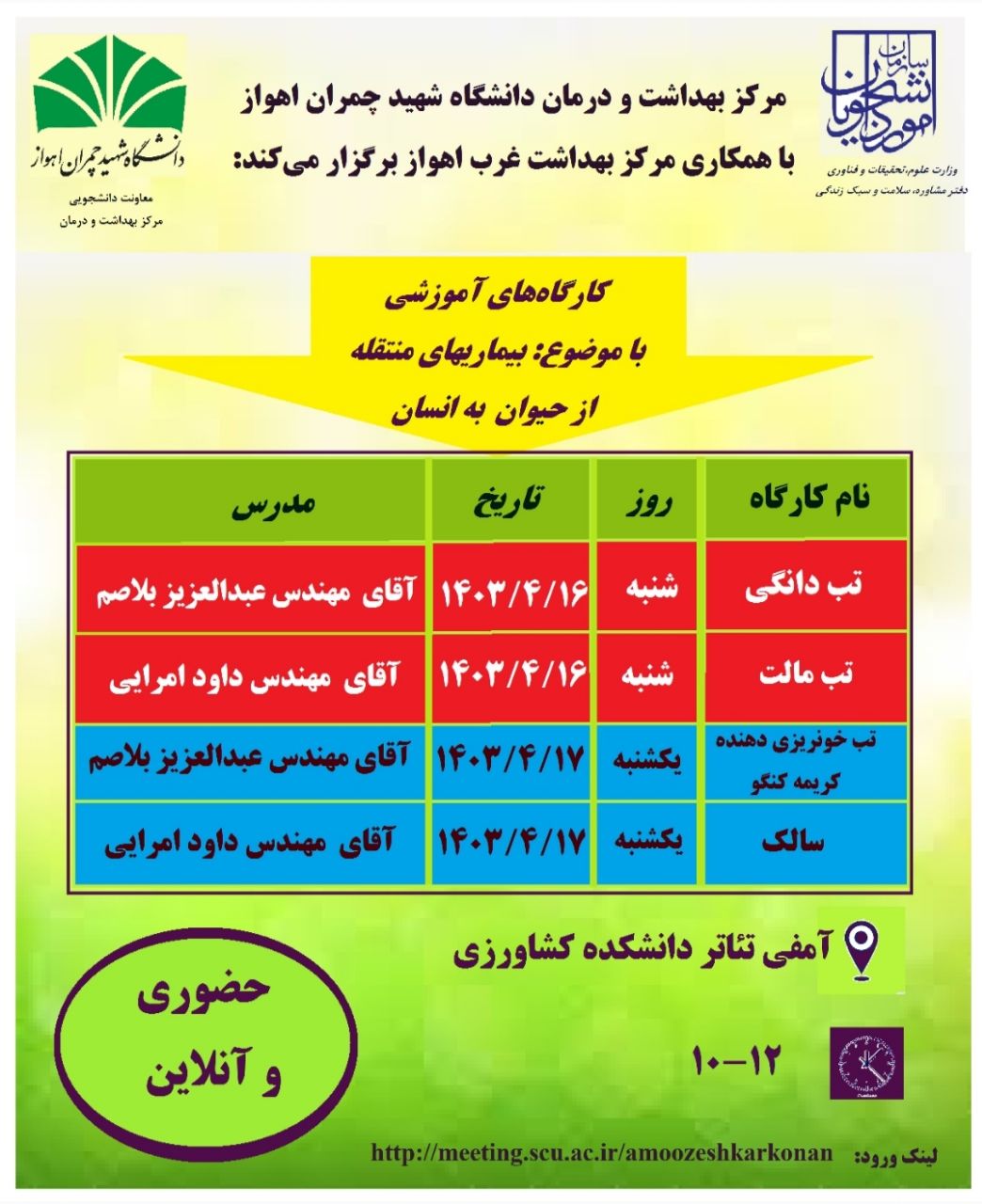 کارگاه 2 روزه بیماریهای منتقله از طریق حشرات و بیماریهای مشترک بین انسان و دام جهت پرسنل و دانشجویان دانشگاه شهید چمران اهواز توسط پرسنل مرکز بهداشت غرب اهواز برگزار شد.