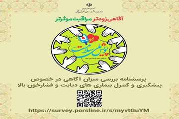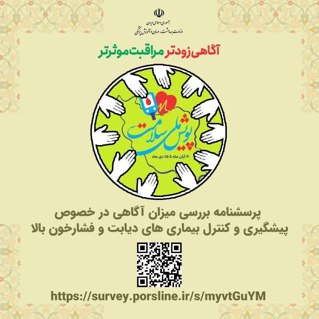 رئیس مرکز بهداشت غرب اهواز با بیان اینکه این طرح به صورت حضوری از طریق تکمیل پرسشنامه با مصاحبه حضوری، اندازه گیری فشارخون و قند خون و غیر حضوری  پرسشنامه آگاهی از طریق پرس لاین صورت میگیرد، از شهروندان خواست برای آگاهی و ارتقا سلامت خود و خانواده خود به نزدیکترین واحدبهداشتی محل سکونت خود مراجعه و یا پرسشنامه مربوط به سنجش آگاهی را در لینک https://survey.porsline.ir/s/myvtGuYM تکمیل نمایید.