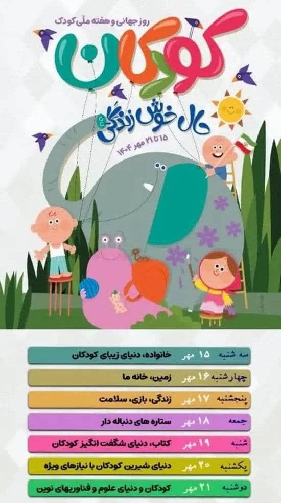 هفته ملی کودک در سال 1404 با شعار «کودکان، حال خوش زندگی» از 15 تا 21 مهر 1404 در سراسر کشور برگزار میشود. این رویداد ملی فرصتی برای یادآوری اهمیت دوران کودکی، حقوق و نیازهای کودکان و توجه به رشد فرهنگی، اجتماعی و عاطفی نسل آینده است.