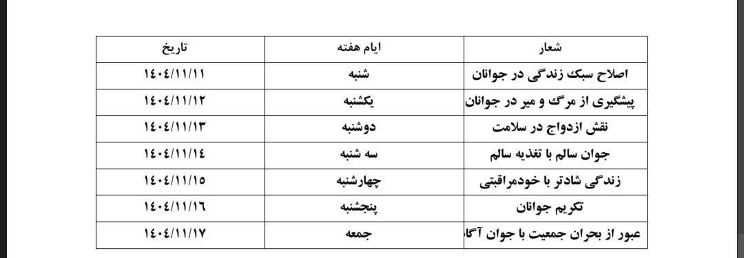 هفته جوان فرصتی است برای توجه ویژه به سلامت جسم، روان و سبک زندگی جوانان و تقویت نشاط اجتماعی، مسئولیتپذیری و امید به آینده.